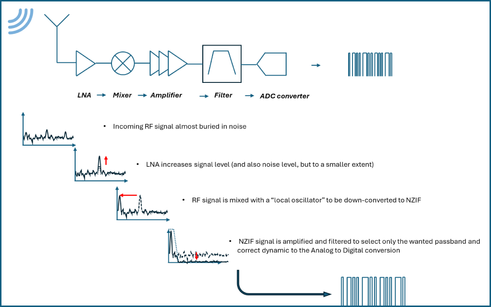 LNA (Low Noise Amplifier) aims, thanks to their gain and noise figure, to provide a sufficiently strong and above-noise signal to be decoded.