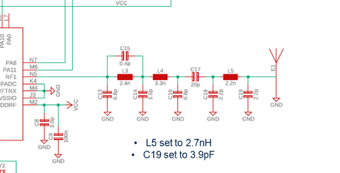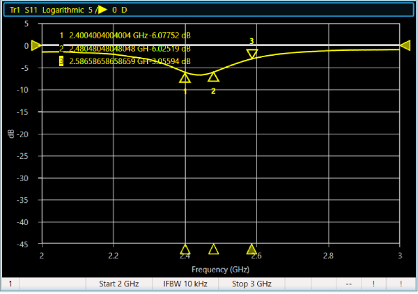 The S11 parameter was measured at antenna input, including its original matching network (L5/C19), but excluding the rest of the components of the RF filter.